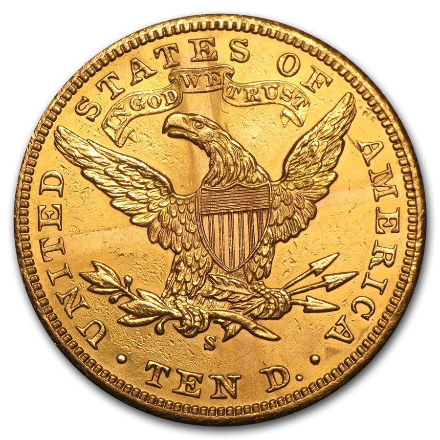 Featuring one of the most iconic coin designs of all time, the $10 Liberty Gold Eagle shows Lady Liberty wearing a coronet, facing left, and surrounded by a ring of stars. The major design change of this series occurred in 1866 when the motto “In God We Trust” was added to the reverse.Important Note:
