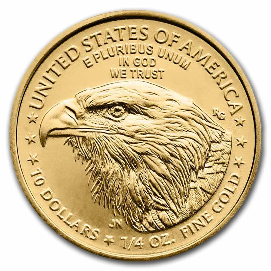 The American Gold Eagle series, introduced in 1986 and authorized by the Gold Bullion Coin Act of 1985, is available in a range of sizes and denominations, including 1 oz, 1/2 oz, 1/4 oz, and 1/10 oz. This coin contains ¼ ounces of gold and has a total weight of approximately 8.48 grams (0.2727 troy ounces), including copper and silver for added durability. This series is cherished for its iconic designs and is highly regarded as a solid investment in precious metals.
